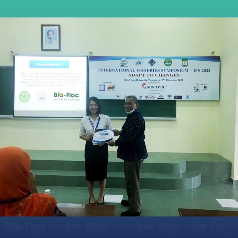Trong buổi hội thảo, tiến sỹ Nguyễn Thị Mai đại diện nhóm nghiên cứu hợp tác VNUA – BIO-FLOC báo cáo kết quả nghiên cứu “Tác động tích cực của lợi khuẩn L.plantarum đến khả năng sử dụng thức ăn và sức đề kháng bệnh lồi mắt do Streptococcus gây ra trên cá rô phi” và được đánh giá rất cao!